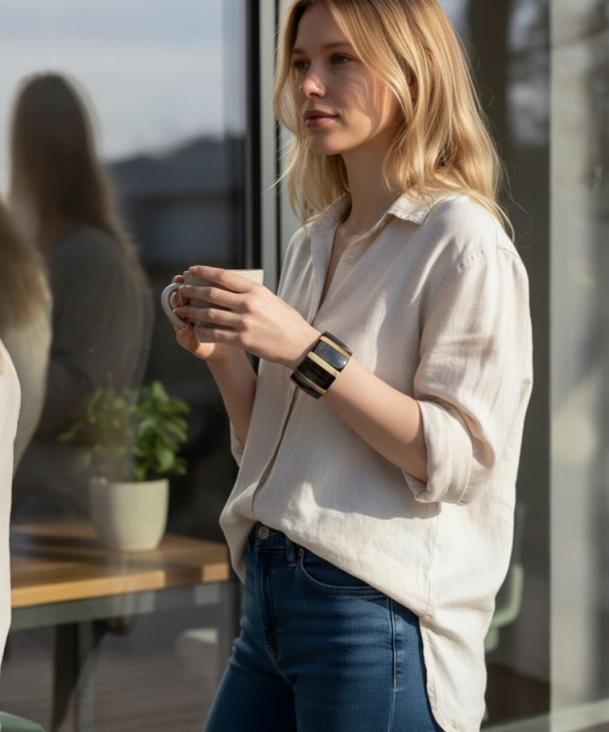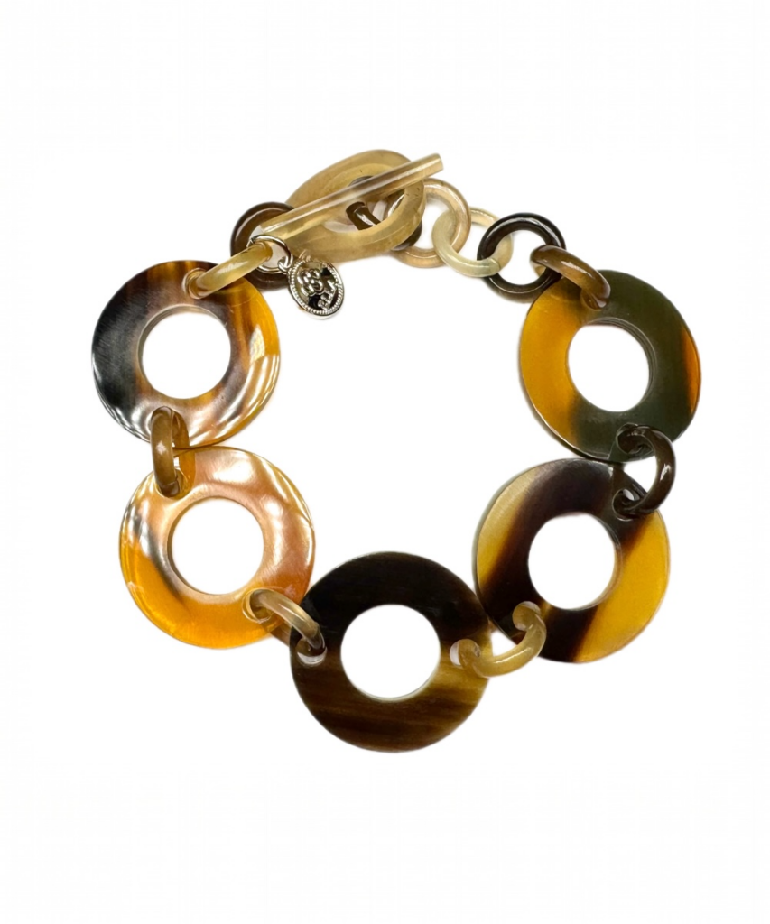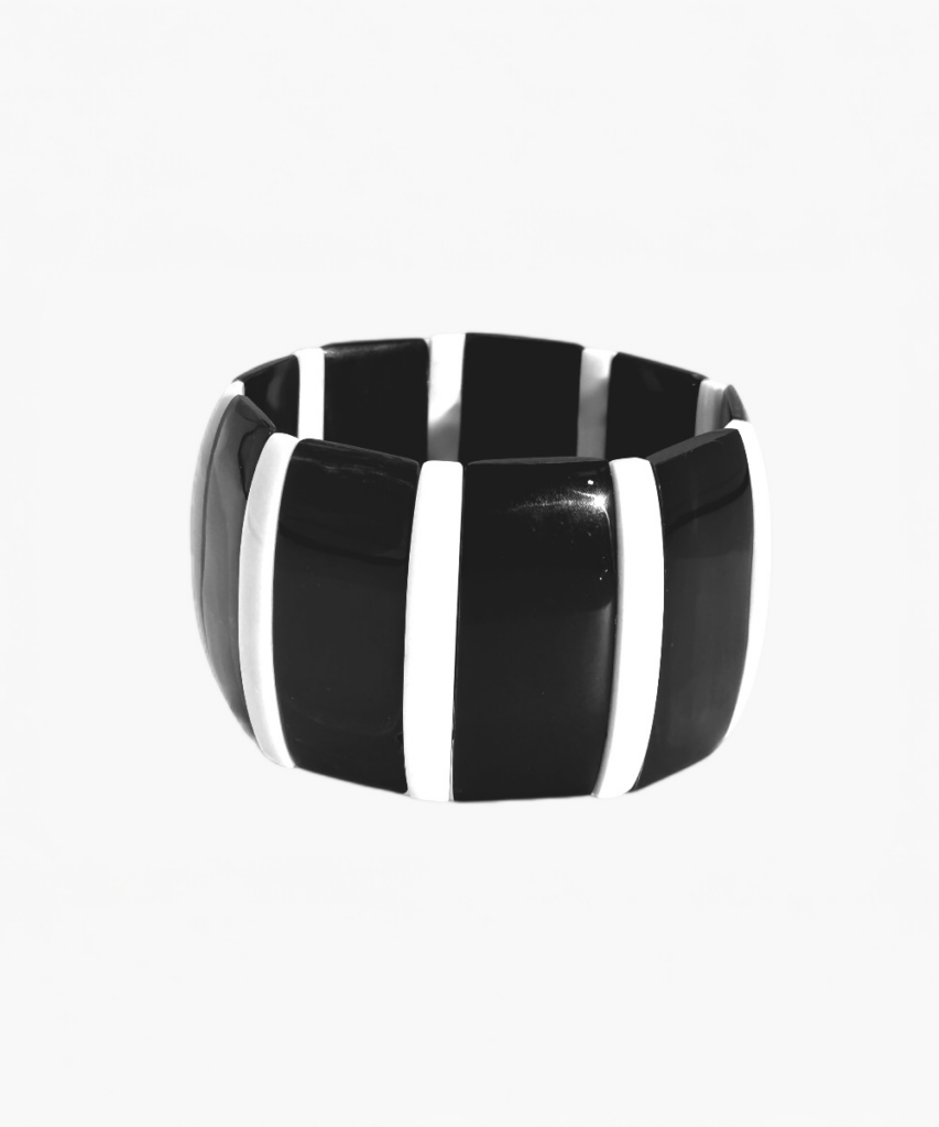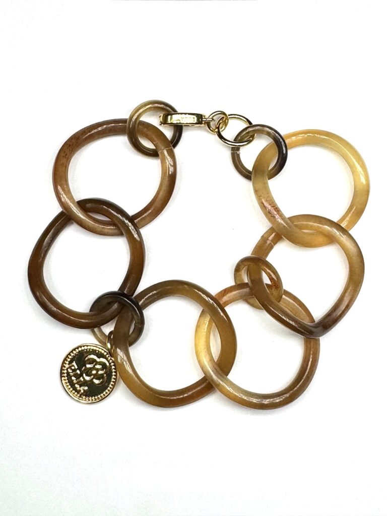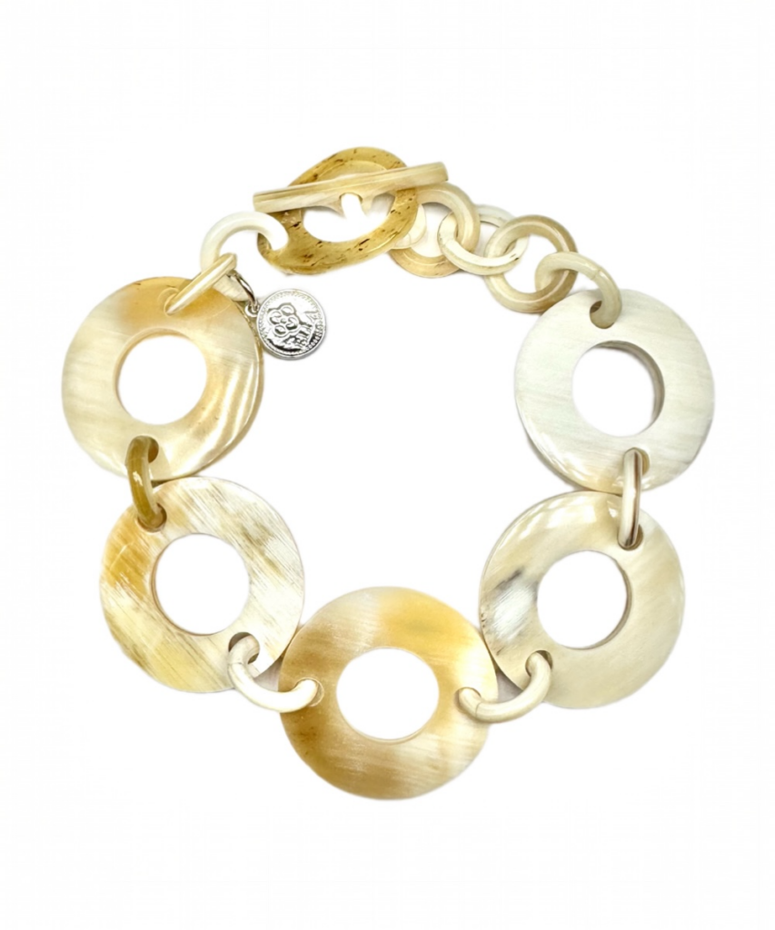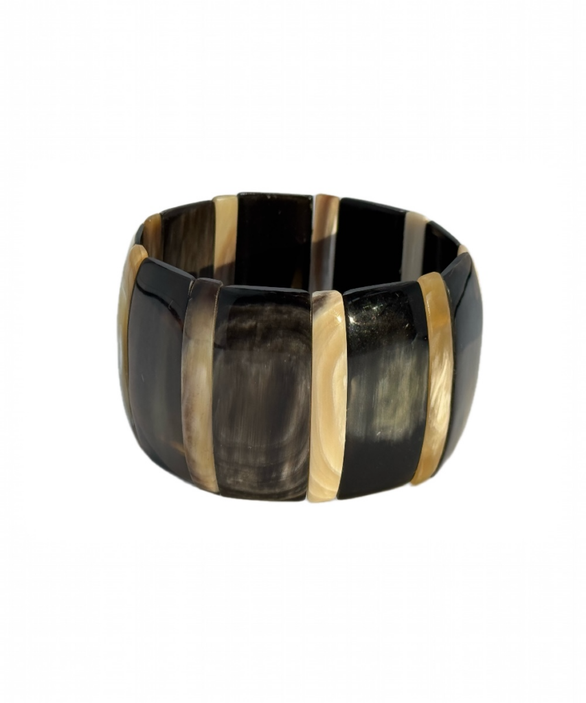 Elastisches Armband aus Büffelhorn sehr angenehm zu tragen, gefertigt aus großen, unregelmäßig geformten Elementen, die dem Schmuckstück eine lebendige und natürliche Lichtwirkung verleihen. Jedes Element reflektiert das Licht auf einzigartige Weise und unterstreicht den handwerklichen Charakter des Materials.