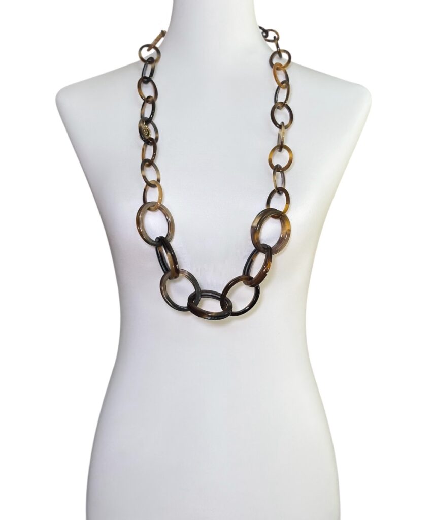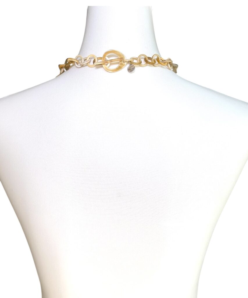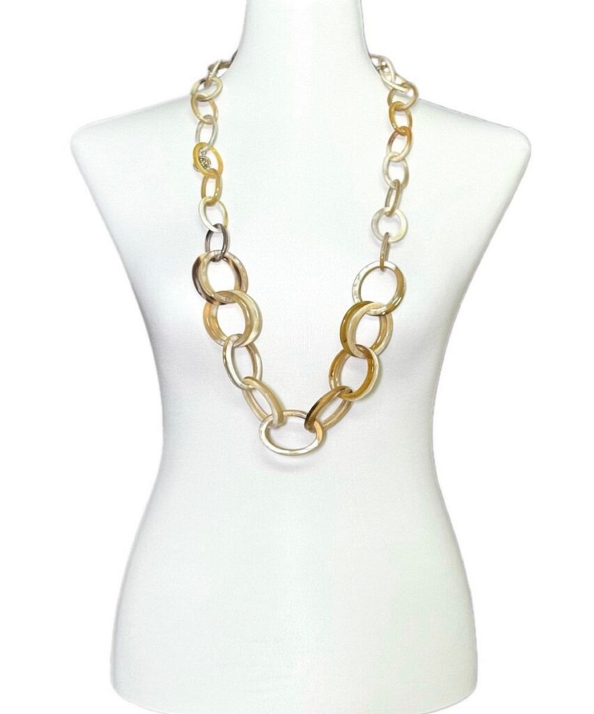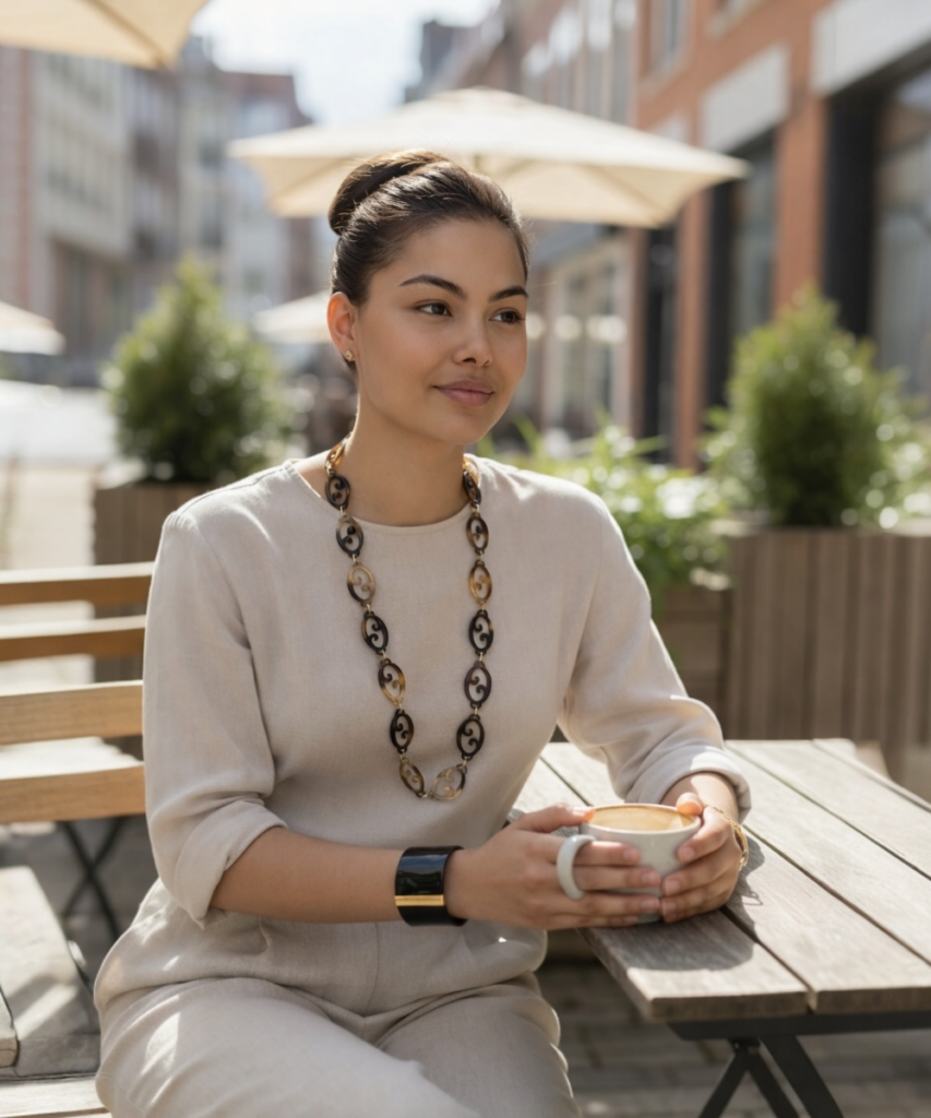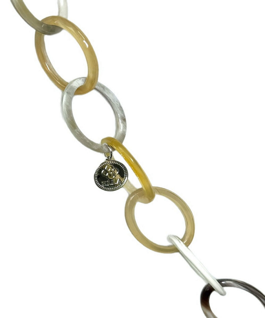 Gefertigt aus natürlichem Horn, ist jedes Stück ein Unikat. Die Kette ist in helleren oder dunkleren Naturtönen erhältlich – je nach Wunsch der Kundin. Die großen, harmonisch geformten Glieder verleihen dem Schmuckstück Charakter und zeitlose Eleganz.