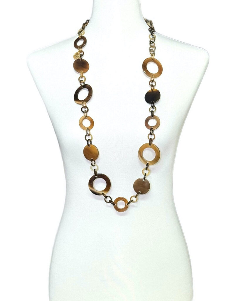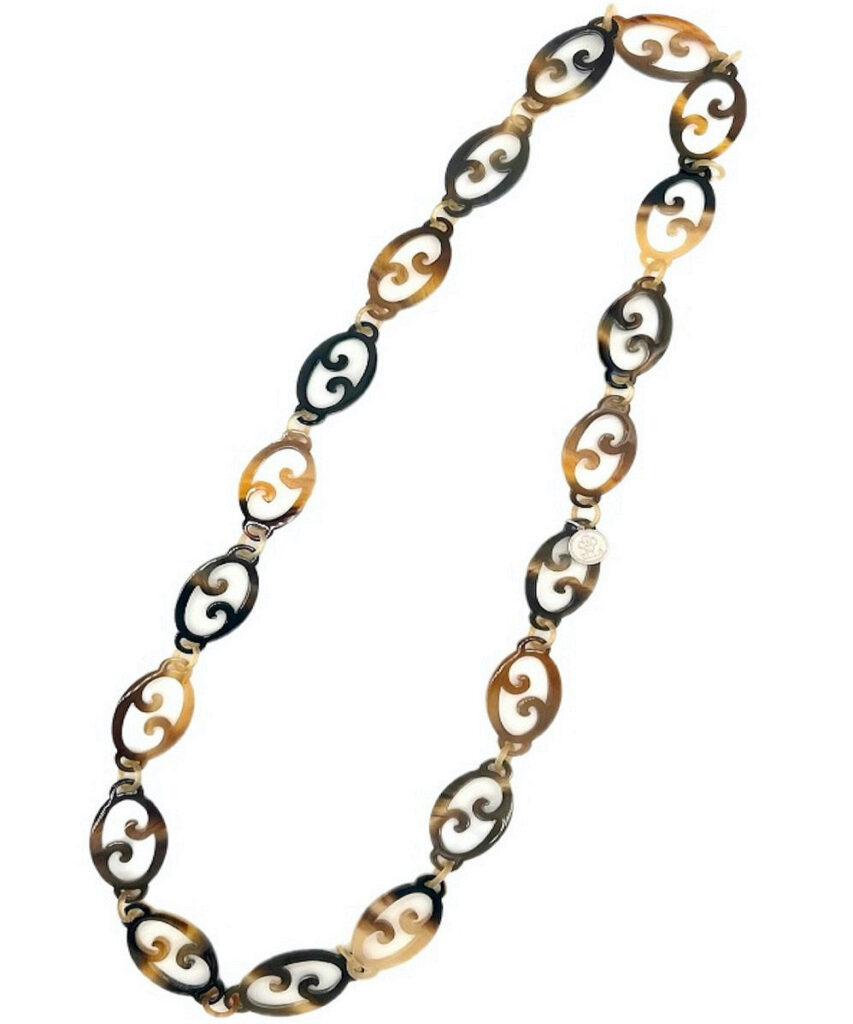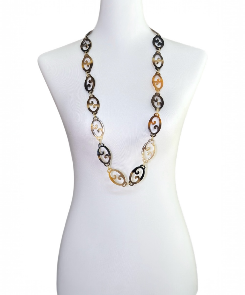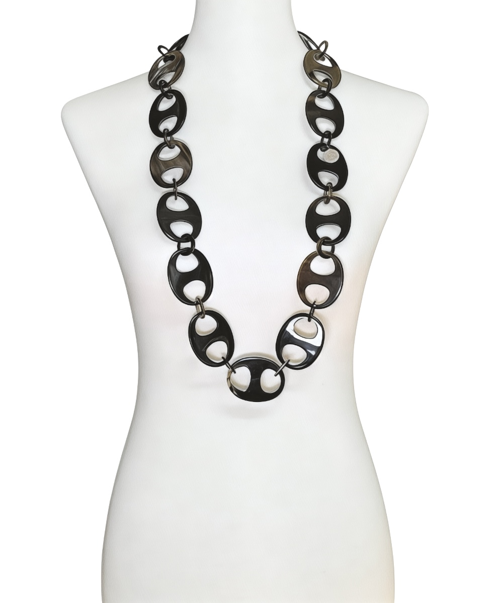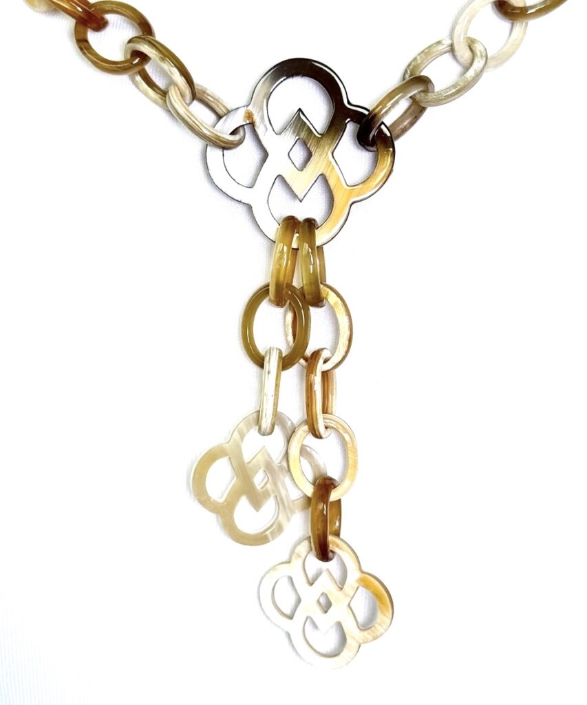Gefertigt aus natürlichem Horn, ist jedes Stück ein Unikat. Die Kette ist in helleren oder dunkleren Naturtönen erhältlich – je nach Wunsch der Kundin. Die großen, harmonisch geformten Glieder verleihen dem Schmuckstück Charakter und zeitlose Eleganz.