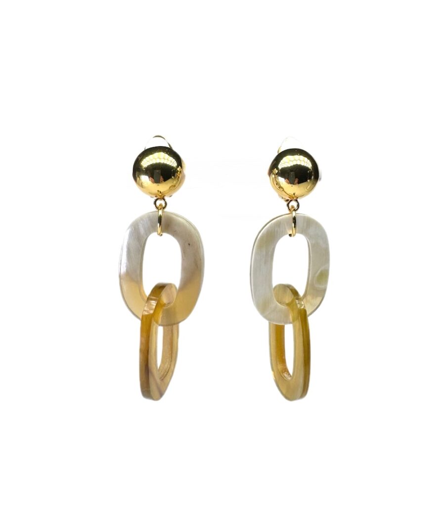 Strahlendes Gold trifft auf klares, modernes Design: Die Ara Clip-Ohrringe verbinden fein lackiertes Büffelhorn mit einer markanten, vertikalen Öffnung – minimalistisch und zugleich ausdrucksstark.