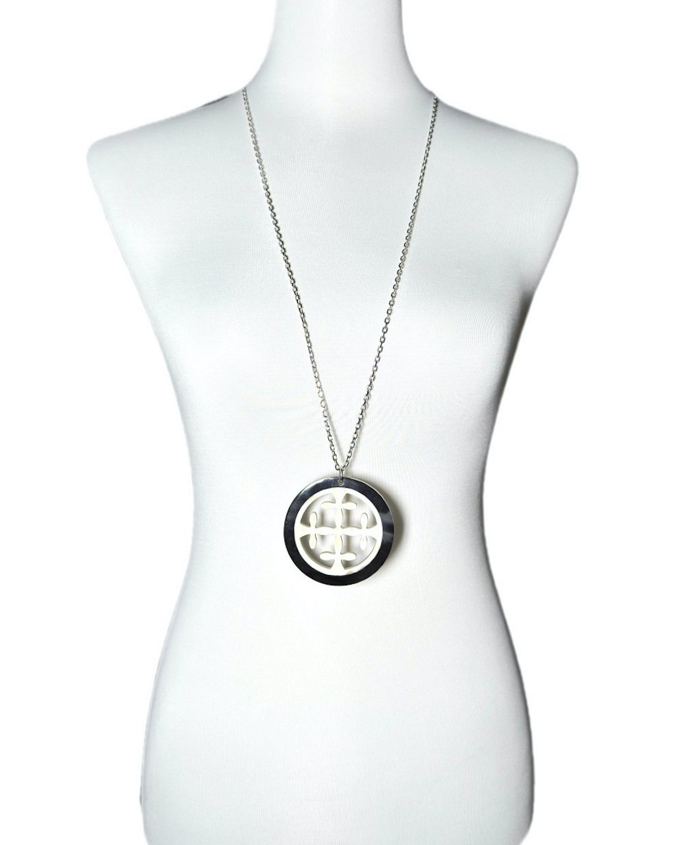 Die Halskette Beata FA besticht durch ihren ausdrucksstarken, zweifarbigen Anhänger aus echtem Büffelhorn. Die natürliche Maserung und die harmonische Kombination der Farbtöne machen jedes Stück zu einem Unikat mit modern-elegantem Charakter.