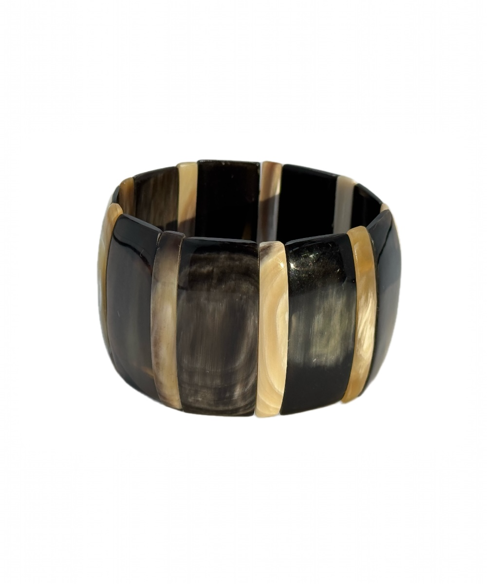 Das Armband Habi wird aus natürlichem Büffelhorn gefertigt und zeichnet sich durch seine warmen, weichen Farbtöne aus. Sanfte Braunnuancen verbinden sich harmonisch mit Akzenten in Schwarz und Elfenbein – jedes Stück ist einzigartig.