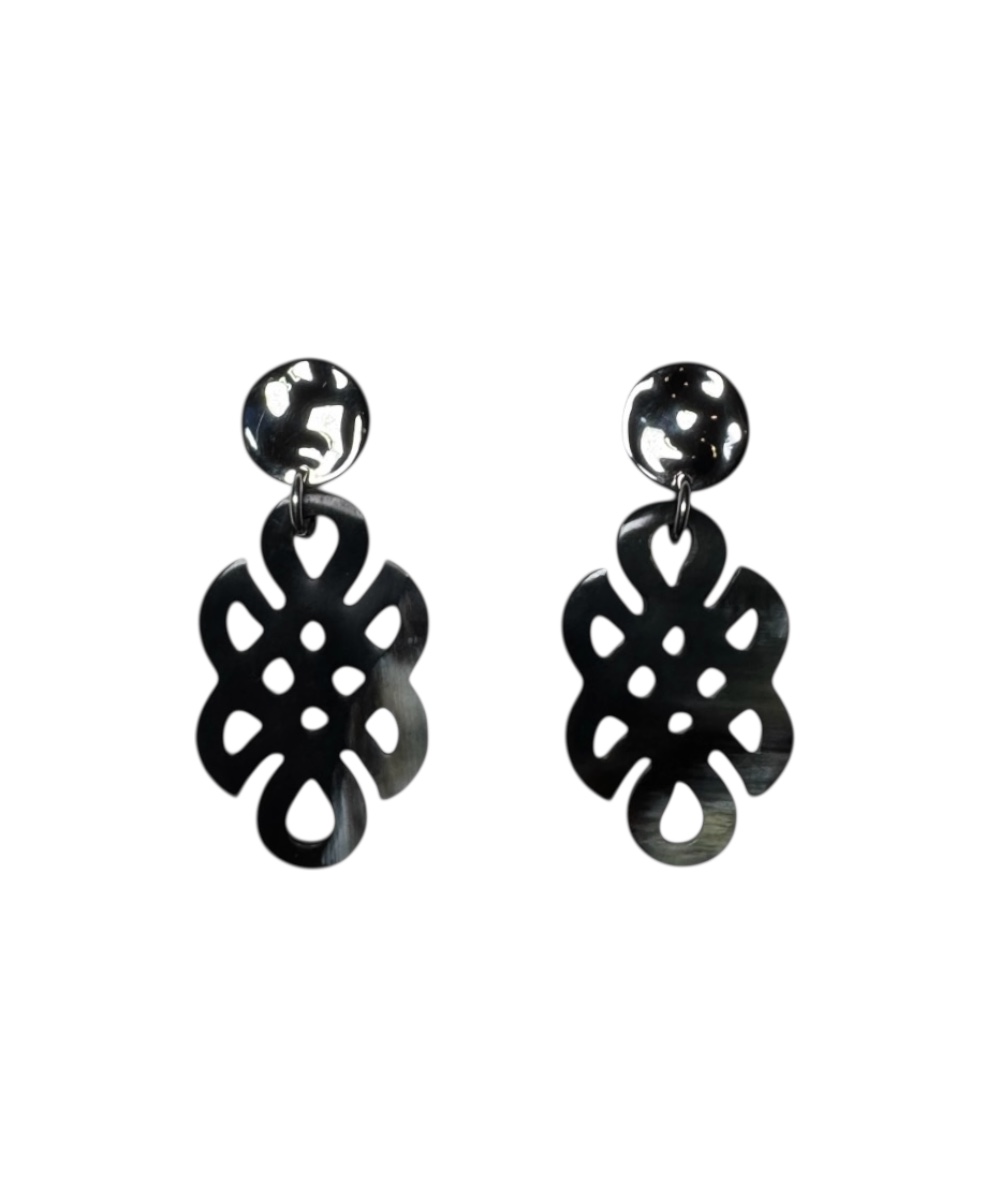 Zarte, federleichte Clip-Ohrringe mit antikem keltischem Unendlichkeits-Symbol – handgefertigt aus fein poliertem, natürlichem Büffelhorn. Gesamtlänge 5,5cm.