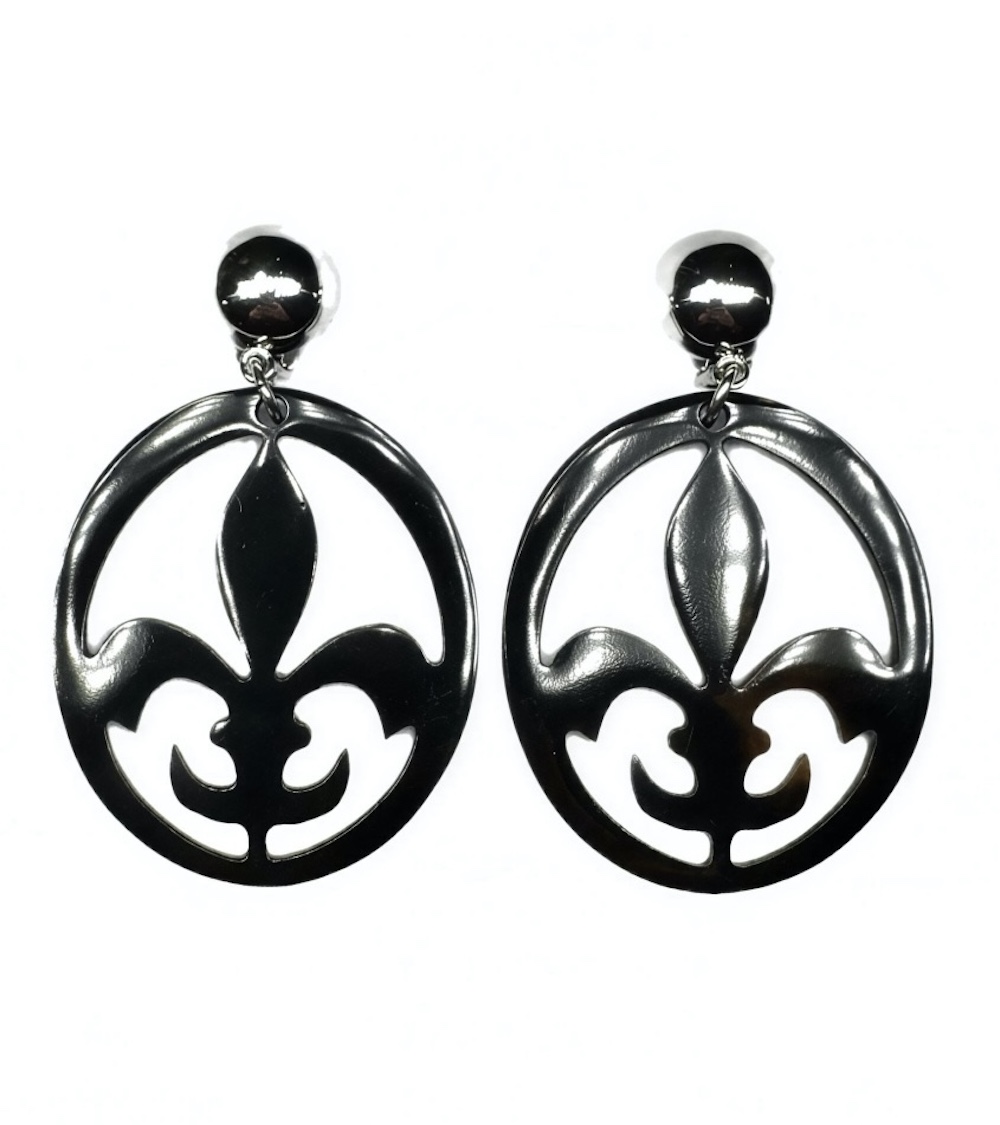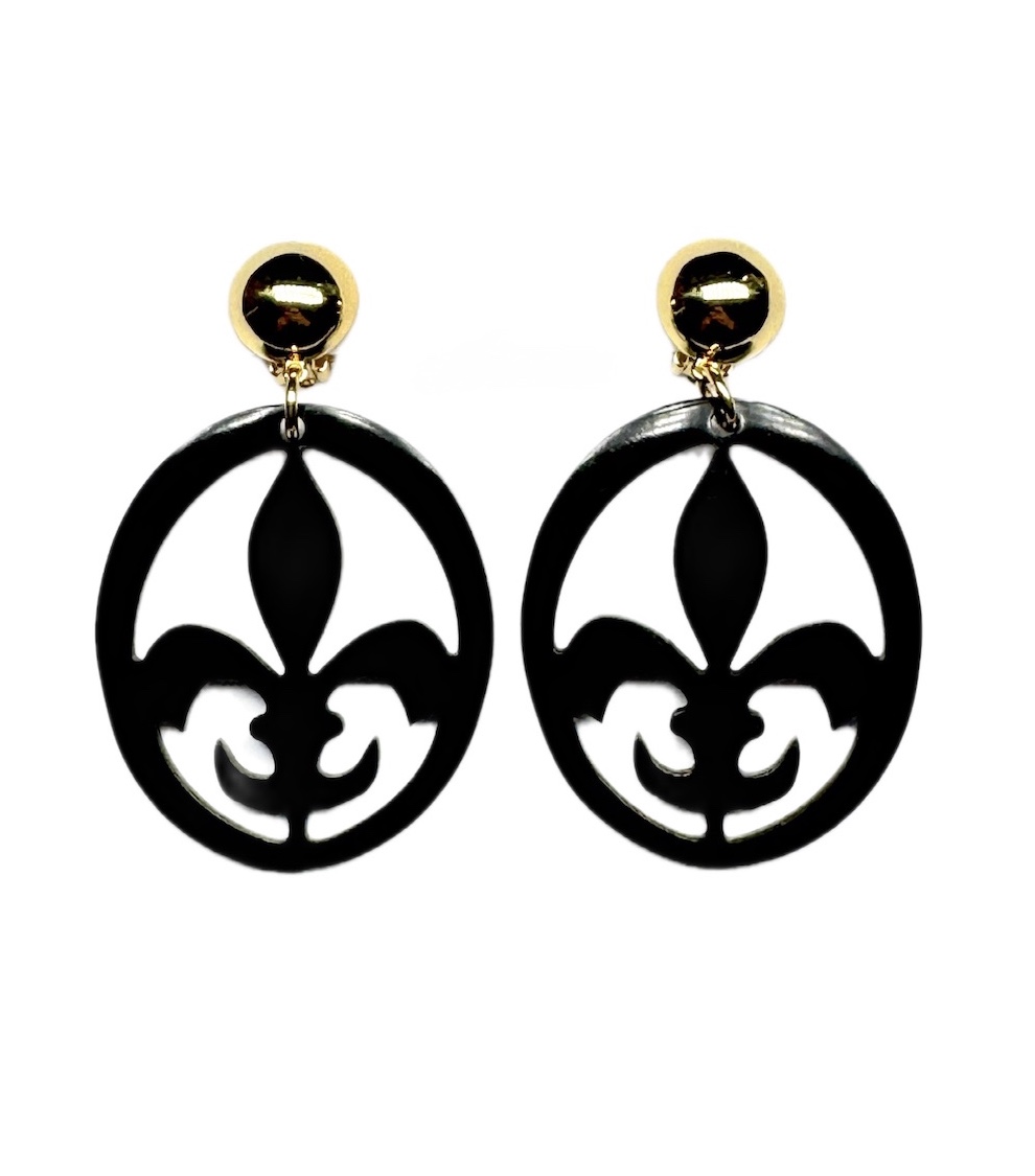 Leichte Clip-Ohrringe mit klassischem Lilien-Motiv – der französischen Fleur-de-Lys. Handgefertigt aus echtem, sorgfältig poliertem Büffelhorn. Gesamtlänge inkl. Clip: 6 cm.