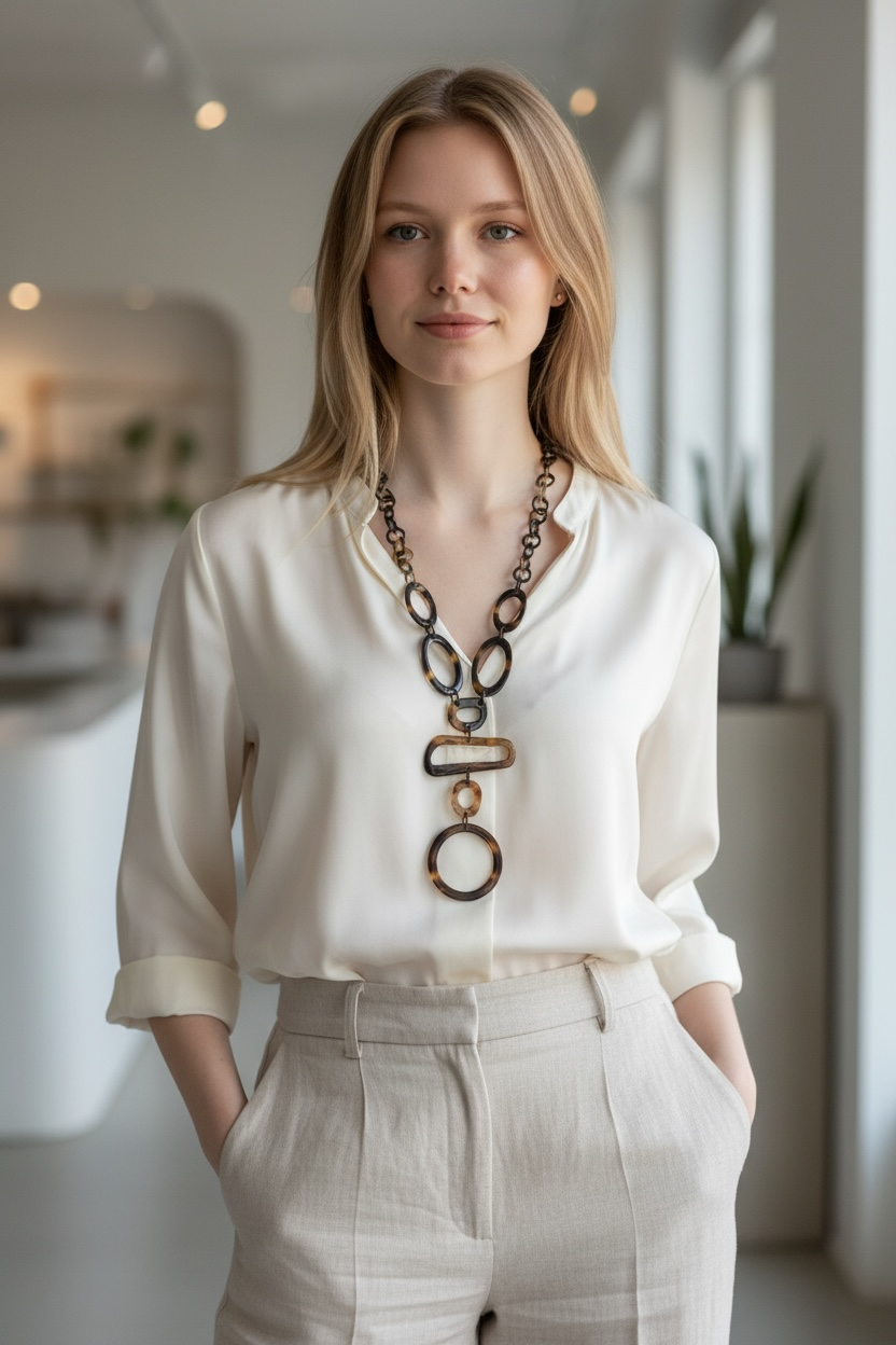 Unsere Sana Kette aus echtem, poliertem Büffelhorn in natürlichen warmen Brauntönen (Tortoise-Shell-Optik mit hellen und dunklen Maserungen) – sportlich-elegant, fein und zeitlos.